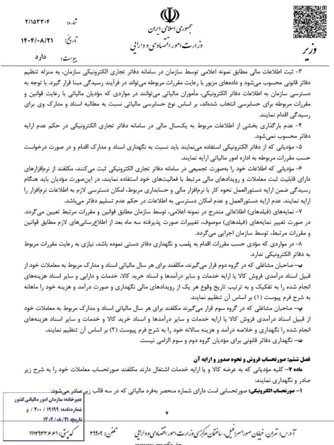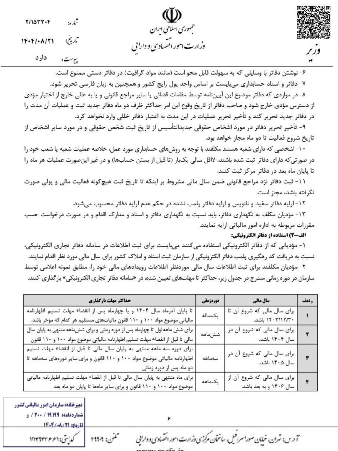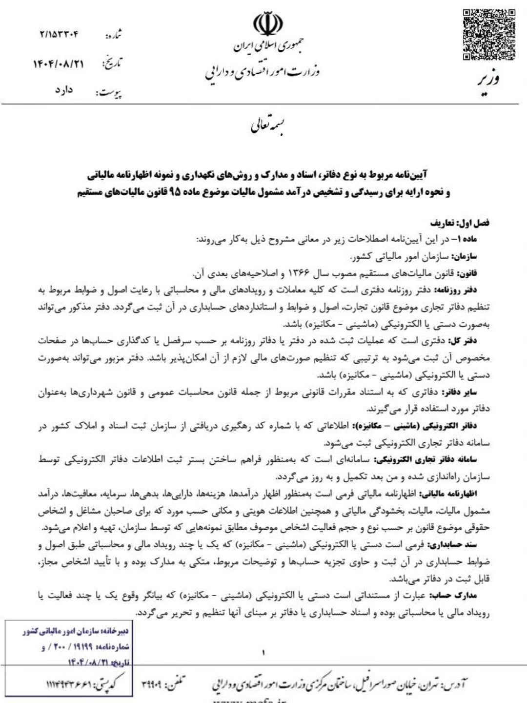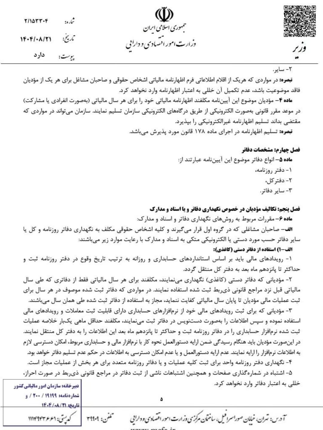 آیین نامه جدید تحریر دفاتر قانونی منضم به دفاتر الکترونیکی مصوب 1404/08/21